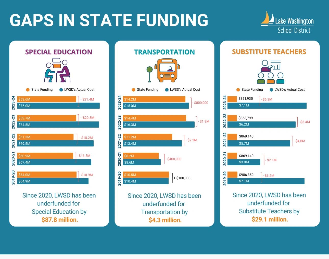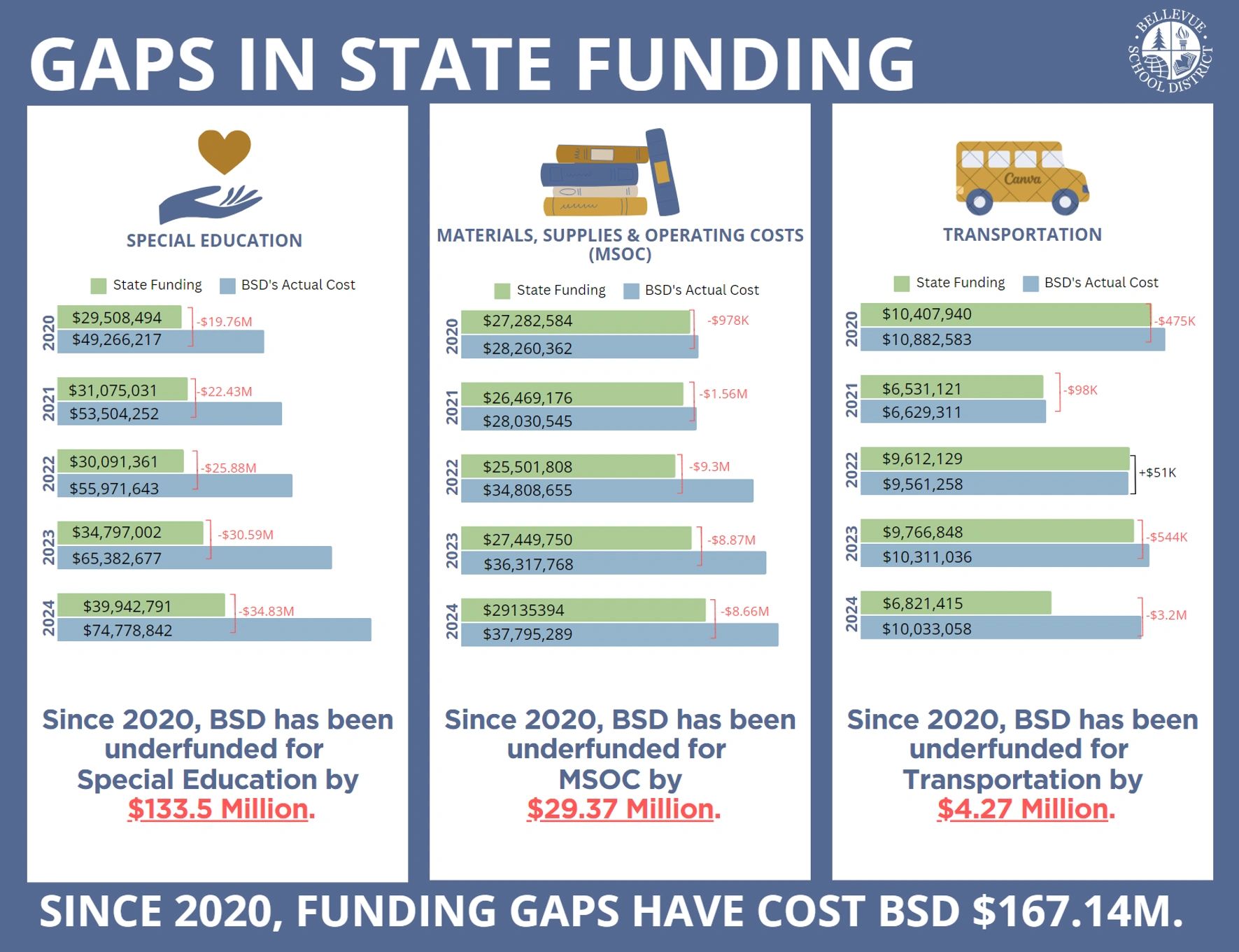 These core issues are causing countless school districts across Washington to experience a financial crisis. The state of Washington is constitutionally responsible for fully funding the costs of basic education but even after reforms (the McCleary “Solution”), the state’s efforts aren’t keeping up with actual expenses.