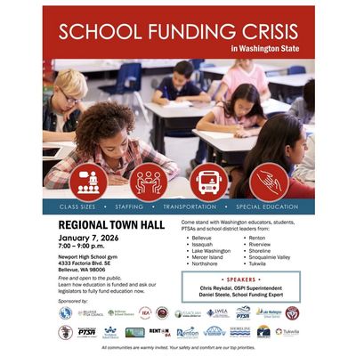 Chris Reykdal, the WA State Superintendent of Public Instruction, along with WA State legislators will join as we educate our communities about the state's education funding model vs. actual costs and the impacts of inflation combined with underfunding in three main categories including Special Education, MSOC (materials, supplies and operating costs), and transportation. WA State K-12 funding and policy expert, Dan Steele, will providing context on how K–12 education is funded in Washington and why funding gaps persist. Please see the full agenda below.